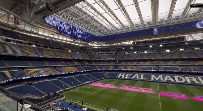 据悉,伯纳乌球场将在明天的西班牙国家德比中盛装亮相。其中最重要的装饰将是一幅覆盖皇家马德里整个看台的巨型Tifo。近日,皇马工作人员正在紧锣密鼓地布置这幅巨型Tifo,看台上将呈现“伟大”字样,并在某一侧看台背景中展示巨型皇马队徽。