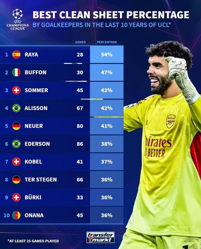 近10年欧冠门将零封率:拉亚54%第1,布冯47%第2,奥纳纳上榜